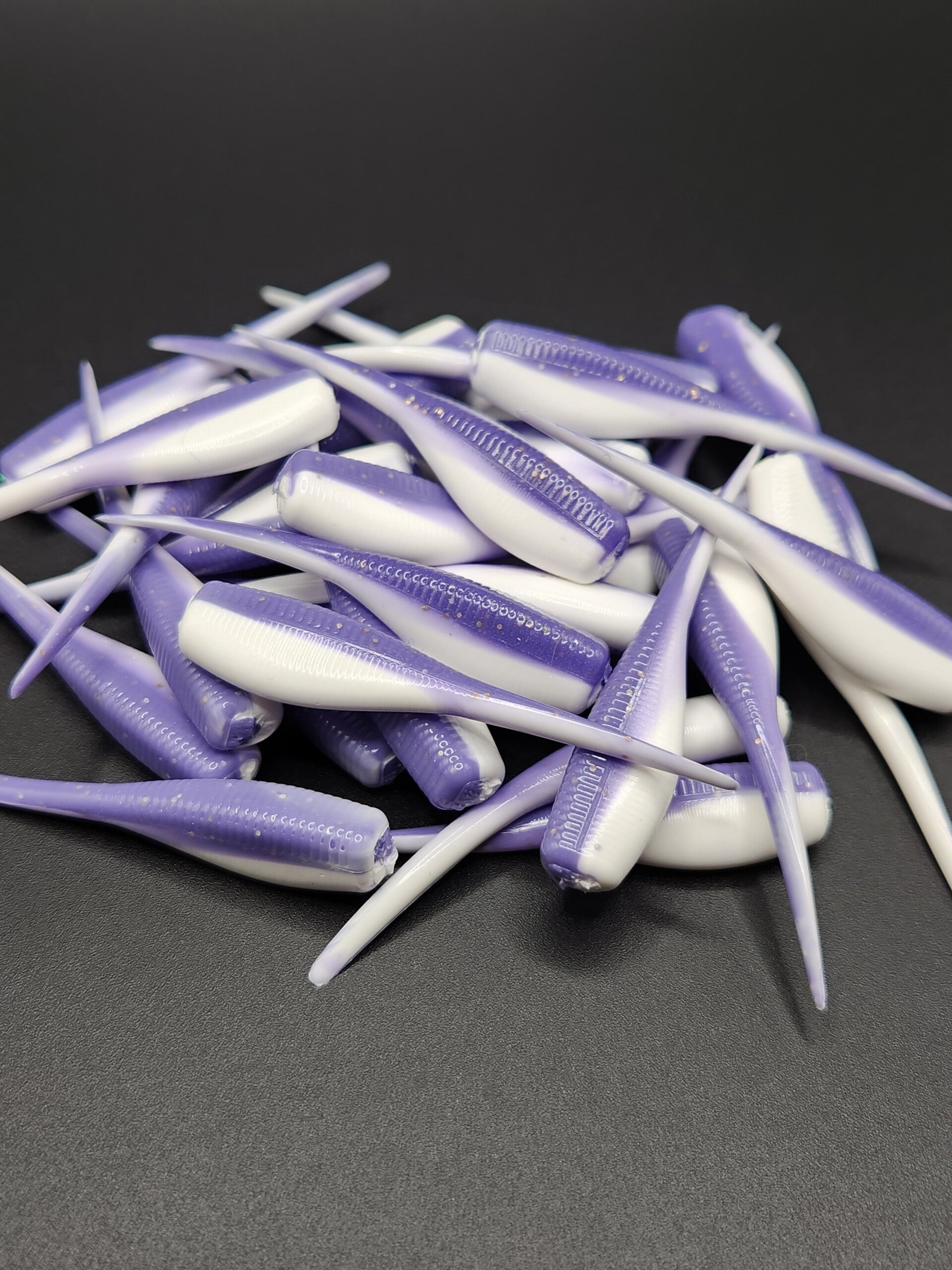 Its beautiful. Originally made as a custom order, the results were too good not to add it to our line-up! We are the only place to find this unique shade of purple with hologram gold flake, paired with a white belly, the Crappies absolutely love this bait. Put it under a float with a steady twitch, or cast and retrieve it back to the boat for the best results. 2 inches long, 10qty per pack.